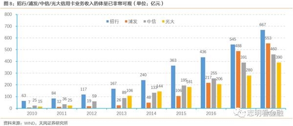 透过银行卡手续费看信用卡非利息收入。对股份行,前者可近似看作是后者;对大行,前者对后者也有一些参考意义。尽管存在瑕疵,但好在银行卡手续费的披露较为充分、口径比较一致,同业间可比性较强,对其展开分析,也能大致把握信用卡非息收入的情况。