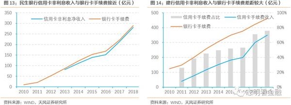 建行的信用卡非息收入与银行卡手续费差距较大。大行中,建行披露了信用卡手续费。但其与银行卡手续费科目相差较大,这主要是因为其借记卡业务客户基础庞大。尽管近年来信用卡部分占比持续提升,18年达76%,依然不能以此作为对信用卡非息收入的估计。