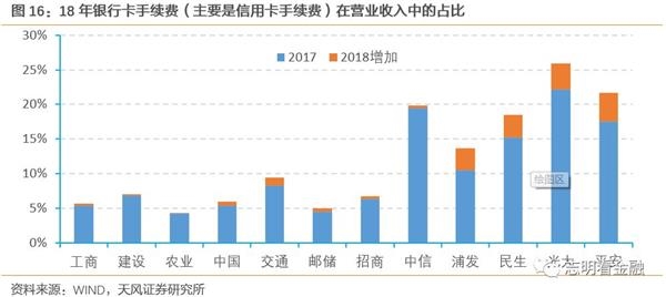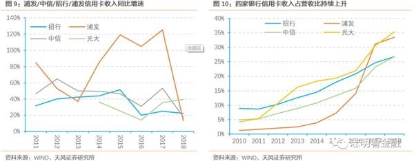 这4家银行里,有3家信用卡收入增速18年有所下滑。浦发/中信/招行的信用卡收入增速18年分别下滑了112 pct、35 pct、2 pct,达到13%、18%、22%,17年的“盛况”不在。光大信用卡业务增速提升了4 pct到39%,经营较为稳健。尽管如此,4家银行的信用卡收入在营收中的占比均大幅提高,提升幅度为2.2 pct到4.9 pct不等。主要因为,尽管信用卡收入增速下滑,但仍然高于其整体营收增速。