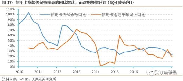 此前我们在18Q3观测到,信用卡出现行业性的逾期率上行,那么18Q4该趋势是否在延续呢?数据指向以下结论:1)信用卡在总贷款中占比上升趋缓,18年底信用卡应偿信贷余额6.85万亿,在整体信贷中占比5.03%,环比仅上行7BP,低于17年同期的24BP;2)因基数提高,18年信用卡贷款同比增速有所下降,17Q4信用卡同比增速曾达到过36.95%的阶段性高点,而到18Q4降至23.20%;3)18Q4信用卡逾期半年以上金额环比下降92亿,逾期半年以上比率下降18BP,逾期额及逾期率环比“双降”,或已企稳。