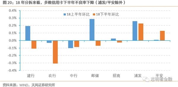 18年下半年不良率并未显著上行。实际上,从已披露不良率数字的银行来看,18年下半年不良率整体呈现的是下行趋势。已披露信用卡贷款不良率的7家银行中,有5家的不良率在18年下半年是环比下降的,下行幅度来看,农行31BP、建行11BP、中行9BP,改善较为显著。