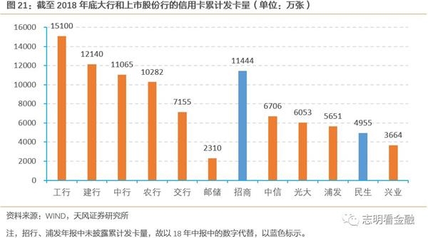 浦发/中信/招行/光大的信用卡收入已非常可观。14家上市银行里有4家在年报中披露了全口径的信用卡收入。2018年,招行、浦发、中信、光大信用卡业务全口径收入分别为667亿、553亿、460亿、390亿,分别在其各自中占比达26.8%、35.5%、26.8%、35.4%,也即1/4甚至1/3以上。这4家披露全口径信用卡收入的股份行,加上平安、民生,18年底的信用卡贷款余额均在4000亿左右及以上,在股份行中是有代表性的。这表明,信用卡业务业务已成为股份行营收的重要支撑点。