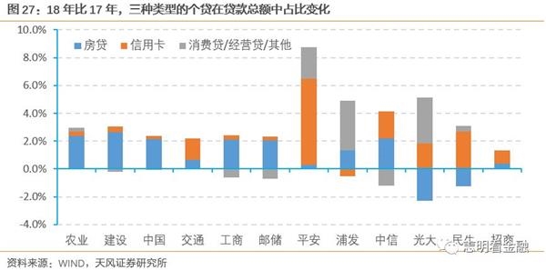 17-18年,主要商业银行个贷占比均显著提升,股份行提升幅度整体高于大行。6家大行各自提升1.6到3.0 pct不等,平均2.3 pct。其中以农行提升较为显著,达3 pct.6家上市股份行(兴业、华夏年报尚未披露)则各自提升1.4到8.7 pct,平均3.7 pct。其中以平安银行较为突出,提升8.7 pct,属于“高者益高”。大行主要以房贷为驱动。除交行是以信用卡为主要驱动因素外,其余5家大行均以房贷为主要驱动因素,信用卡贡献较少。消费贷/经营贷/其他的贡献更不显著,工行、邮储在其上的占比甚至明显下降。股份行主要由消费贷/经营贷为驱动。平安银行分别由信用卡和消费贷及经营贷贡献6.2 pct和2.2 pct的个贷占比提升。浦发、光大主要靠消费贷及经营贷提升个贷占比。