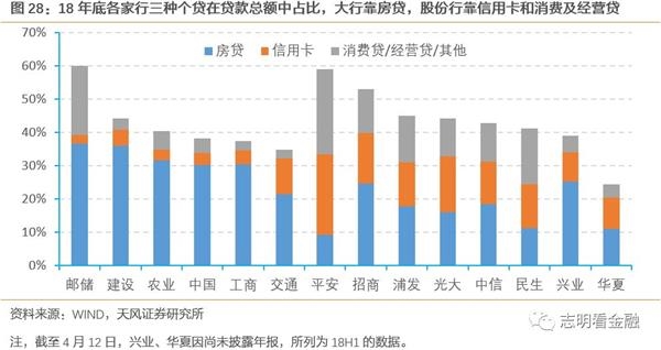 大行的个贷占比稳步提升,股份行则更多波动。平安继13年之后,个贷占比在18H1时再度赶超招行,并在18年末时,差距进一步拉大。表明其售转型在表内信贷部分成效卓著,并由信用卡和消费贷平均用力,“两条腿走路”,基础相对扎实。光大的个贷占比提升也较显著,且推进进度较稳。