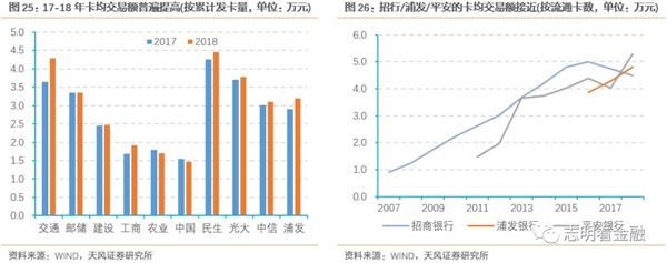 卡均交易额有所上升。信用卡累计发卡量、流通卡数、流通户数,是年报里常见的客户数量指标,但经常披露不全,我们尽量在统一口径之下比较卡均/户均的交易情况。按累计发卡量计算卡均交易量,可发现18年相比17年,多数银行卡均交易量均有所增加,表明居民对透支消费越来越适应。按流通卡数计算卡均交易量,招行、平安、浦发比较接近,都在5万元上下。