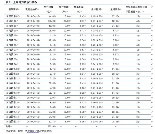 地方债方面, 上周地方债发行23期,发行规模550.9亿元,4月前两周地方债发行明显放缓;上周地方债到期394.26亿元,周内净融资额156.64亿元。从地方在发行情况来看,上周地方债发行省际间分化明显扩大,尽管大部分省份地方债发行利率按照“基准+25BP”执行,但上周内蒙古有三期,河北省有一期债券按照“基准+40BP”发行,此外内蒙古还有两期专项债按照“基准+50BP”发行;地方债认购倍数方面,上周内蒙古发行的各期地方债发行认购倍数均在10倍以内,远低于其他省份。尽管25-40BP浮动区间是下限而非上限,但内蒙古地方债发行利率上移,反映出地方债供给压力正逐步体现出来,地方债发行逐渐从“卖方市场”转变为“买方市场”。后续来看,未来地方债发行更加突出“资质”属性,各省经济发展水平、政府财力以及显性或隐性债务率水平等指标或成为地方债最终发行利率与基准差值高低的决定因素。