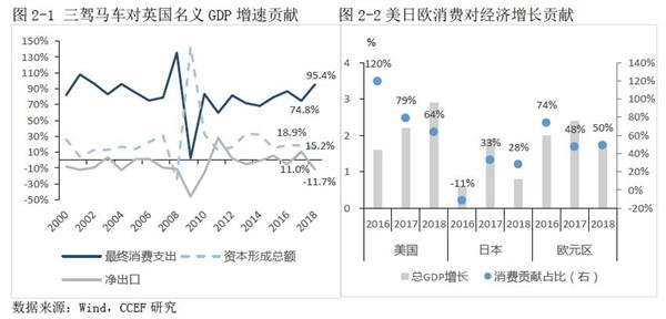 1。 英国经济增速在G7集团中最为平稳。国内消费是英国经济的主要支撑,消费对增长贡献常年维持在80%的水平。