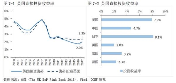 然而,流入英国的产业资金所获取的收益率并不高。数据显示,直接投资英国的外资收益率自金融危机以来一直维持在2.3%的水平,这与长期英国经济增速较低有关。此外,英国直接投资海外的收益率仅为2%,位列主要发达国家末位,与英国直接投资主要投向地区欧洲整体的收益率不高有关。因此,英国的对外投资很难像日本一样,给本国经济带来大量的海外利润回流。