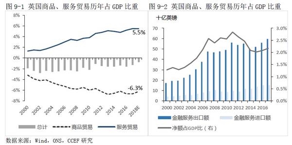3。作为英国服务贸易顺差的主要来源,金融业是英国最重要的支柱产业,金融服务业贡献40%的服务顺差。