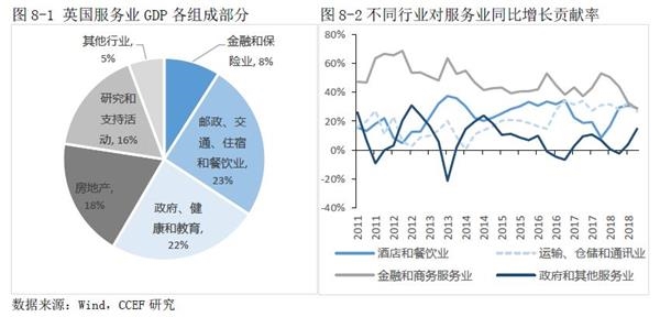 得益于伦敦作为全球三大金融中心之一,服务业是英国经济的重要支柱,占GDP约80%,从业人数占劳动力总数的75%。其中金融和保险业虽然在英国服务业GDP中的比例仅为8%,但近五年对服务业GDP同比增长率的平均贡献却高达44.8%,成为服务业增长的最大动力。