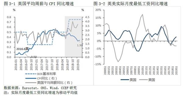 2016-2017年,受脱欧影响,对输入性通胀预期导致国内通胀水平的快速上升,自2017年开始,通胀率高于薪资增长率,对消费支出增长产生抑制。为了改变这种情况,2017年11月和2018年9月,英国央行通过两次加息,使得同比增长率从3%回落至2%以下。与此同时,最低工资水平增长带动起的薪资增长迹象已显现。数据显示,英国实际月度最低工资同比增速自2017上半年最低点-7.9%快速提升至当前约4%的水平(同期美国未显著改善),从2018年下半年开始,薪资整体增长速度显著高于通胀,逐渐走扩的增速差为消费支出扩张提供了动力,并支撑起英国经济缓慢复苏。