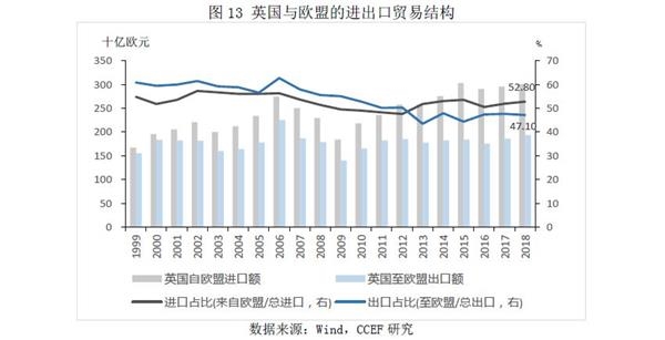 2018年英国出口欧盟的比例约占其总出口量的47.1%,脱欧导致的关税增加将在一定程度上减弱英国出口在欧盟的竞争优势。事实上,英国服务业出口面向全球(例如芯片设计服务主要为亚洲、美国等芯片制造商提供授权),而商品出口更多面向欧盟,数据显示,英国出口欧盟的商品贸易、服务贸易分别占本国总商品、服务出口的约50%、40%,因此在结构上,脱欧对英国制造业的影响将高于服务业,而英国制造业中具有出口比较优势的化工、汽车产业及生物医疗产业领域,目前相对德法两国并没有明显优势,未来关税提高对出口竞争力的减弱,最终将影响到投资这部分高端制造企业的整体收益水平。
