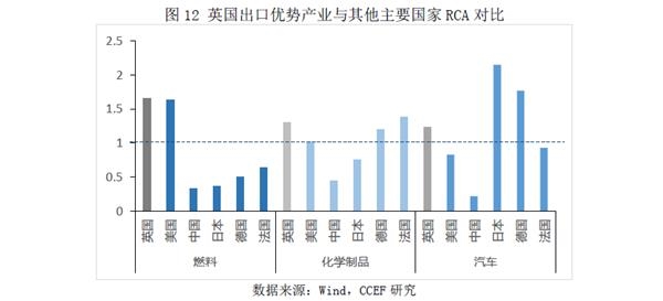 整体而言,当前英国主要的制造业部门中,能源、化工、汽车、航空产业领域具有全球竞争优势。从比较优势指标(RCA)来看,英国在能源燃料的全球出口比较优势上位列主要国家第一,化工产业仅次于法国位列第二,汽车产业位于日德之后位列第三。此外,以发动机为代表的航空制造业等高端制造领域优势依旧明显,英国罗尔斯·罗伊斯是全球三大航空发动机生产商之一(其余两家为美国的GE、惠普),在商用领域中波音、空客的大部分发动机均是由其提供。