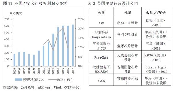 以英国ARM企业为例,在半导体领域与英特尔一起分别垄断了移动市场、PC服务器市场的终端芯片的设计供应,当前全球超过99%的智能手机均采用ARM架构处理器,其中苹果、三星、华为也都使用了其架构,技术垄断优势支撑起ARM约20%的ROE水平。事实上,英国在该行业的各种芯片子领域均具全球优势地位,幻想科技Imagination、英桥无限电子CSR、PicoChip、欧胜微电子WOLFSON、XMOS均是优秀公司的代表。