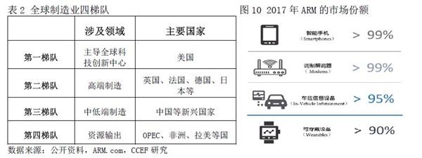 伴随其整体工业规模的衰退,英国商品制造出口的全球占比不断下降,然而,像日本等发达国家一样,英国制造业凭借其在上游领域中的基础科学积累与技术创新,依然稳定地站在全球制造业第二梯队,部分领域处于世界顶尖水平并具有垄断地位,其中最具代表的是半导体芯片设计产业,若将半导体行业的企业分为IP供应商、IC设计上、晶圆制造厂和封测厂四类,芯片设计作为IP供应商则位于产业链的顶端,目前全球只有美英两国具有世界一流的能力。