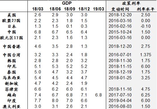 越南一季度经济增长总体平稳,但由于缺乏像去年一样的重点企业集中投产带动及受部分商品出口下滑和非洲猪瘟的影响,GDP增幅低于去年同期7.38%的水平。4月4日,印度央行宣布将利率从6.25%下调至6.00%,符合市场预期,印度2月通胀只有2.57%,已经连续8个月低于央行设定的4%中期通胀目标,而2018年Q4印度经济增速仅为6.6%,大幅低于前三个季度,今年的经济增长状况同样不容乐观,加之今年4-5月印度将举行大选,都构成印度央行选择继续降息的支撑因素。