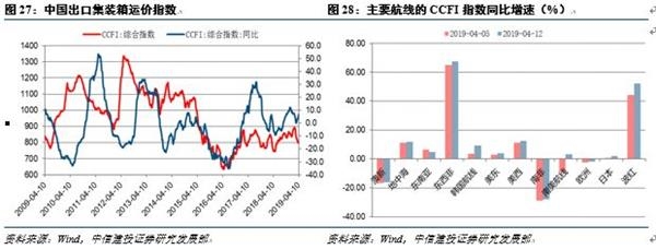 出口方面,出口指数增速回升。本周中国出口集装箱运价综合指数同比增速回升1.7个百分点。分航线看,中国对东西非、波红航线出口指数增速高位回升,对韩国、地中海、美东、美西、南美航线出口指数增速回升,中国对澳新、南非出口指数降幅缩小。