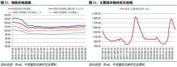 钢铁价格回升,库存回落,高炉开工率回升。本周(4月12日)Myspic钢铁综合价格指较上周回升1.61%,其中螺纹钢、热卷价格、冷板价格分别环比变动2.09%、1.59%、0.51%。库存方面,主要城市主要钢材品种合计库存环比回落。高炉开工率本周环比回升1.80%。