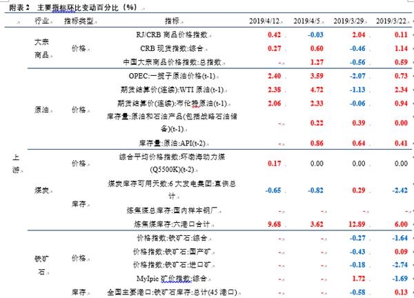 本周(4月12日)RJ/CRB现货指数环比变动0.41%。CRB现货指数回升0.27%。原油价格继续走高,库存回升。OPEC一揽子原油价格环比回升2.40%,WTI与布伦特原油期货结算价周环比回升1.28%和1.72%。库存方面,上周EIA原油库存环比回升0.22%,API原油库存环比回升0.86%。