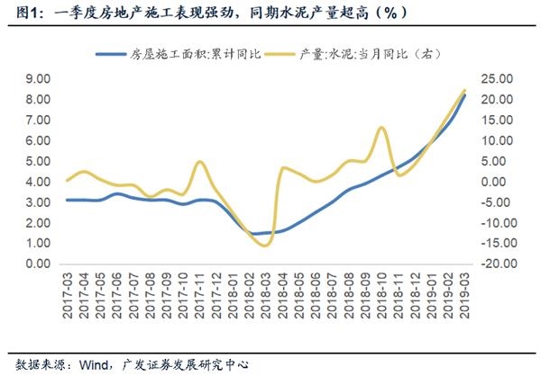 房地产施工端韧性应该是带动GDP的关键线索之一,同期水泥产量超高也显示出建筑部门的活跃。在前期报告《2019,经济韧性从何而来》中,我们提供了一个解释视角:这轮房地产周期相当于从棚改货币化到货币政策稳增长之间的过渡,施工从经验规律看与资金可得性关联较大,而施工端韧性超预期可能是微观数据韧性的原因之一。实际出来的数据初步证实了这一点。一季度房地产施工表现强劲,增速从1-2月的6.8%进一步上升至8.2%。一季度水泥产量增速为9.4%,其中3月为22.2%。亦可验证建筑业部门的活跃。