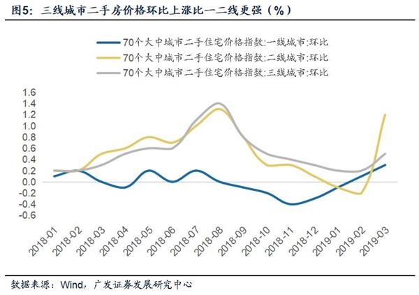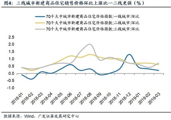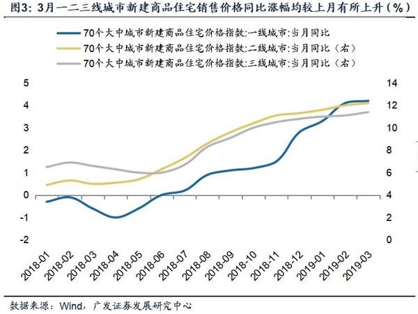 房地产销售面积亦较1-2月反弹,价格短周期触底信号也已出现,预计二季度将进一步确认销售周期底部。房地产销售面积累计增速从1-2月的-3.6%收窄为-0.9%,隐含的单月增速已反弹至1.8%;同期销售额增速反弹至5.6%。销售额增速变化更为明显在逻辑上隐含着价格触底的信号。同期统计局数据显示,3月一二三线城市新建商品住宅销售价格同比涨幅均较上月有所上升。尤其值得注意的是,35个三线城市新建商品住宅销售价格环比上涨0.7%,二手格环比上涨0.5%,涨幅均扩大0.3个点。三线价格环比比一二线更强可能是一个重要信息,因为市场对于三线的担忧一直大于一二线。当然,3月数据往往有季节性扰动,但从经验规律看,价格信号将对销售带来一定支撑。我们维持前期判断,即二季度将进一步确认地产销售周期底部。