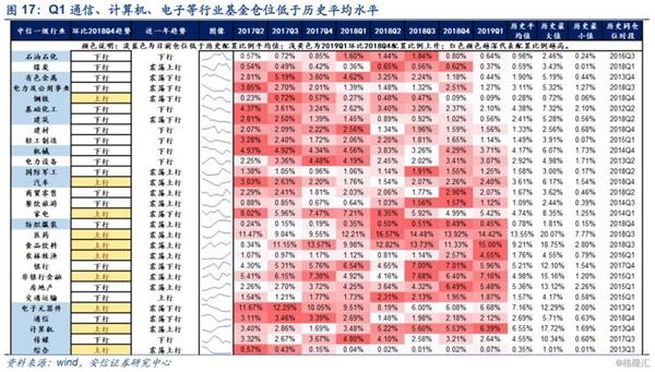 2012年Q1至2019年Q1行业持股仓位统计,通信、计算机、电子等低于历史平均配置水平。具体情况如下: