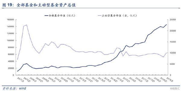 从基金总规模来看,全部基金规模有所上升,主动型基金规模大幅上升。2019Q1全部基金资产总值为146211.12亿元,较上季度137518.54亿元环比上升6.32%;主动型基金资产总值为10035.94亿元,较上季度8111.06亿元上升23.73%。