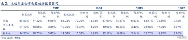 从配置比例来看,2019Q1主板处于低配(-6.68pct),中小板(+3.05pct)和创业板(+3.63pct)超配。