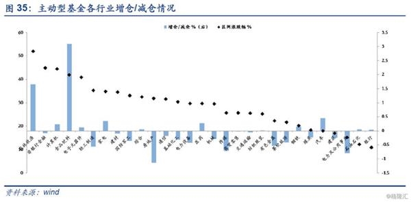 相对净增仓较多的行业有食品饮料(+3.10pct)、农林牧渔(+1.66pct)、汽车(+0.44pct)、家电(+0.35pct)和医药(+0.28pct);