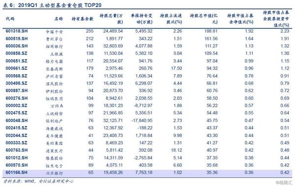 重仓股投资集中程度上升。2019Q1主动型基金重仓股持股总市值前20的个股包括中国平安、贵州茅台、招商银行、五粮液、格力电器等,持股总市值1459.01亿元(前值936.42亿元),占股票投资比重32.14%(前值26.86%),从占比的角度来看较2018Q4集中趋势增强。