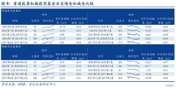 回顾历史来看,国内基金仓位变动与市场行情大致趋同,呈现出高仓位拐点往往滞后于市场的特征。我们注意到在A股市场上行行情通常伴随着基金加仓,在下跌周期中基金大多减仓避险,两者走势整体呈现大致趋同。在加仓和减仓时点方面,我们选取普通和偏股具有代表性的2009年4月-8月、2010年7月-11月、2012年12月-2013年4月、2014年8月-2015年7月和2017年6月-12月的五段行情进行观察,注意到,无论是全部基金股票仓位、普通还是偏股型基金,其加仓的时点一般与行情起点基本吻合,加仓过程对于市场起到推动作用。同时,高仓位拐点往往滞后于市场,一般在10-30天左右。