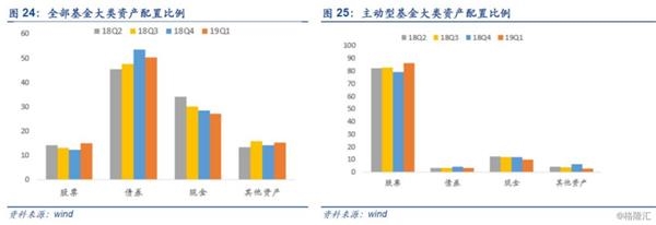 2019Q1全部基金和主动型基金都增加股票配置。全部基金方面,2019Q1全部基金继续增加对股票的配置,比例由上季的12.34%上升至15.09%。全部基金对债券和现金的配置依然保持在较高位置,对债券的配置比例由上季的53.58%降至50.20%,对现金的配置比例由上季的28.35%降至27.15%。主动型基金方面,主动型基金股票配置比例也有所上升,由上季的79.27%上升至86.03%;债券配置比例有所下降,由上季的4.19%降至3.20%;现金配置比例有所下降,由上季的12.09%降至9.68%。总体来看,全部基金和主动分别对股票的配置上升2.75pct和6.76pct。