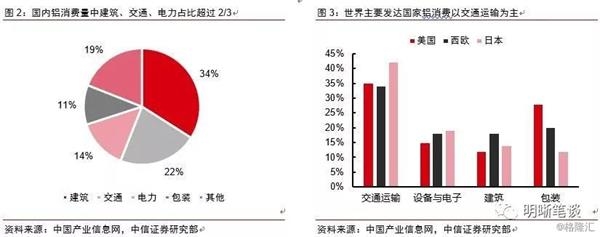 国内建筑业占据铝消费第一大行业,而发达国家铝消费则以汽车制造为主。铝合金由于密度低、单位质量的能量吸收能力强等特性,是汽车等交通工具使用合金的不二之选,世界主要发达国家的铝消费量最大的行业均为交通运输。而国内由于目前所处的城镇化阶段,建筑用铝依然是铝消费第一大行业。根据中国产业信息网数据,2017年国内建筑/交通/电力/包装用铝消费量占比分别为34%/22%/14%/11%。铝合金在建筑行业主要用于墙板、顶板、角铝等支撑性结构,以及门窗框、吊顶、护栏等装饰性结构。从长时间维度来看,伴随国内城镇化进程的逐步完成,国内铝消费结构将向发达国家靠拢。
