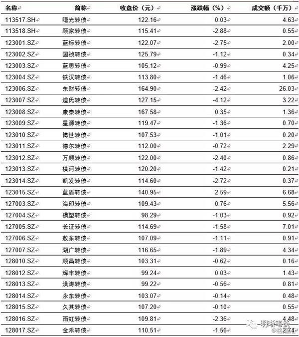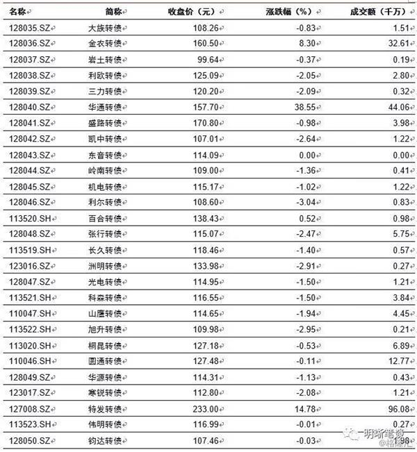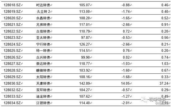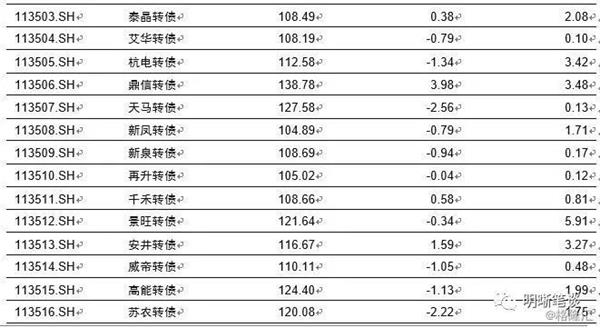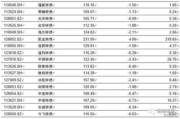 4月23日转债市场,平价指数收于103.33点,下跌2.02%,转债指数收于114.59点,下跌1.25%。148支上市可交易转债,除东音转债横盘外,26支上涨,121支下跌。其中华通转债(38.55%)、百姓转债(15.90%)、精测转债(14.90%)领涨,道氏转债(-4.12%)、富祥转债(-3.55%)、常熟转债(-3.14)领跌。148支可转债正股,除横盘外,30支上涨,117支下跌。其中,(10.03%)、(10.03%)、(10.00%)、(10.00%)领涨,(-5.30%)、(-5.87%)(-6.69%)领跌。