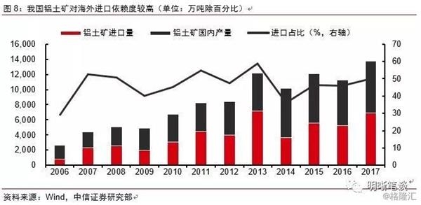 作为铝加工产业链最上游的铝土矿,我国对海外供给依赖度较高。中国铝土矿储量在世界范围内相比较低,根据国家统计局数据,2016年底探明储量约为10.1亿吨,仅占储量第一的几内亚的约14%,且我国铝土矿品质较差,98%以上为加工困难、耗能高的一水硬铝石。但是由于需求拉动,我国是全球铝土矿产量第二大国,据Wind数据,2017年国内产量为6902万吨,仅次于澳大利亚的8942万吨。可以说我国正以不足全球3%的储量生产着全球25%的铝土矿。但是即便如此,我国对海外供给的依赖度依然较高,2018全年进口铝土矿8262万吨,过去十年国内每年消费的铝土矿约50%来源于进口。