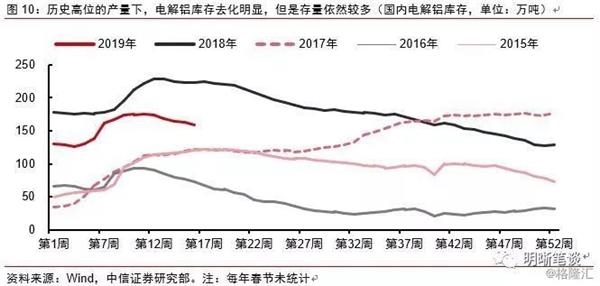 三月以来电解铝库存去化明显,但是存量水平依然较高。根据阿拉丁数据,今年1~2月国内电解铝产量585万吨,同比仅增0.9%;据统计局数据,3月电解铝产量288万吨,同比增加3.4%。虽然亏损和政策限产等因素导致产量增速不高,但是产量水平仍处于历史高位。三月以来电解铝库存去化明显,显示需求明显回暖。然而当前库存水平虽较2018年整体有所减少,仍明显高于2015~2017三年。居高不下的存量库存,以及因亏损导致的大量闲置产能,限制了需求回暖所能拉动的价格上限,行业整体仍处于供给过剩的状态。