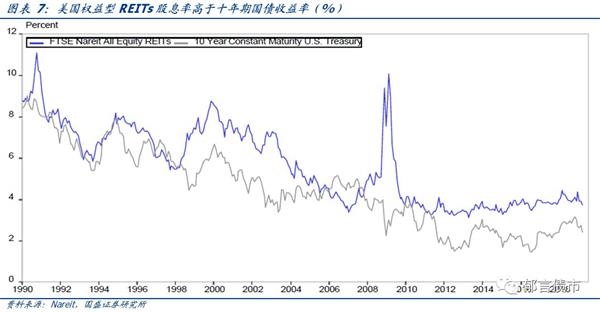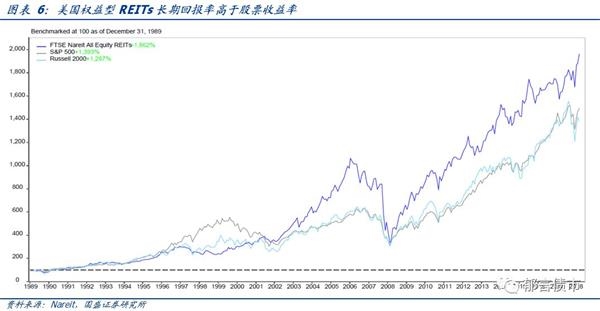 权益型REITs长期回报率高于股票收益率,股息率高于十年期国债收益率。以1989年12月31日为基准,2003年以来,富时Nareit权益型REITs的回报率持续高于标普500。截至2019年3月末,权益型REITs复合年化收益率达11.8%,而道琼斯工业指数复合年化收益率为7.4%,标普500指数为10.5%,纳斯达克指数为9.33%。从股息率看,1990年以来,权益型REITs股息率在大多数年份高于十年期国债收益率。