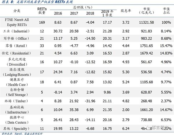 权益型REITs中,零售、住宅、基础设施、健康医疗、写字楼和工业REITs市值占比较高。按照Nareit分类,REITs分为工业、写字楼、零售、住宅、多元化用途、酒店/度假、健康医疗、自助仓储、林场、基础设施、数据中心和其他12类。从市值占比看,截至2019年3月31日,零售(15.47%)、住宅(14.83%)、基础设施(14.67%)、健康医疗(9.77%)、写字楼(8.68%)、工业(8.14%)合计占比达71.57%,酒店/度假REITs数量较多(17只),但市值占比相对较小(4.74%),基础设施REITs数量相对较少,为6只。