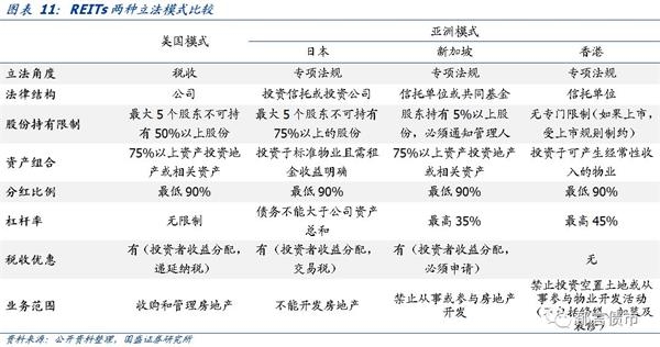 美国模式REITs是税收制度推动,规定了REITs符合税收优惠的条件。而亚洲模式主要采用信托型,通过专项立法,对REITs的设立条件、投资资产、收益分配等方面予以明确规定。二者虽然在立法角度和法律结构方面存在差异,但在具体规定中都凸显了REITs的不动产属性,第一,资产组合规定,如美国、新加坡明确规定75%以上资产投资地产或相关资产;第二,分红比例至少为90%;第三,业务范围,允许收购和管理物业,但不允许REITs参与房地产开发。
