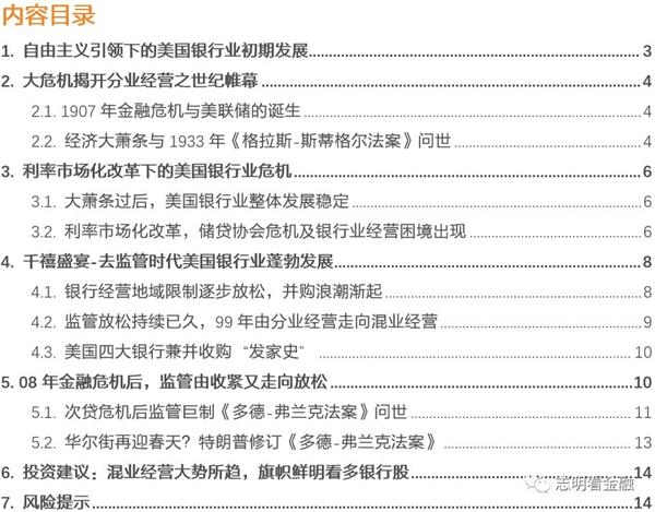 混业经营乃大趋势。纵观美国银行业百年风云,经济危机往往催生银行业监管收紧,之后又逐步放松,循环往复。进入21世纪以来,混业经营成为趋势,也是各国提升金融业实力的必经之路。