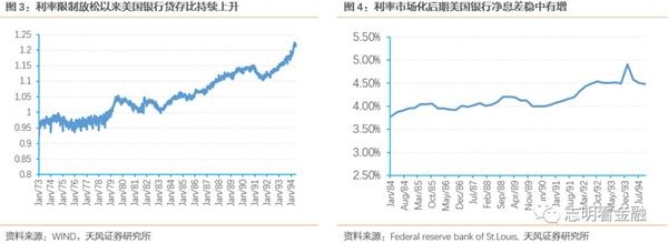 利率市场化后期银行业净息差稳中有升。从一般认知出发,利率市场化带来的存款利率上限放开将使存贷利差缩小,进而使得净息差收窄。但是,美国利率市场化后期银行净息差小幅上升,论其原因,主要为存贷结构良性调整,资金使用效率提升,如美国银行业贷存比从1973年0.92上升至1993年1.15,信贷结构中个贷占比高也使得其贷款利率受影响小。