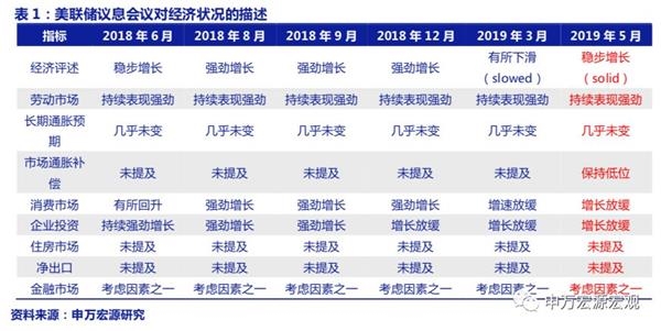 在5月美联储议息会议中,美联储不加息,符合之前市场的一致预期。会议声明对经济活动的描述由3月的“slowed from its solid rate”到5月的“solid rate”。鲍威尔表示当前未看到任何经济过热的证据,同时也表示ISM制造业指数仍然偏正面,表明美国经济适度增长,预计消费和商业开支都将在2019年支持美国经济的增长。此外,与中国达成贸易协定的影响后续会慢慢显现。美联储再次重申当前的利率立场是适宜的,目前没有看上调或下调的强烈理由,并且美联储的货币政策不会受到短期的政治因素影响。