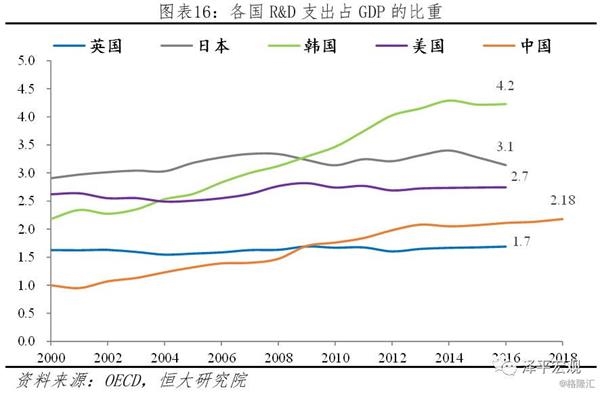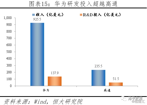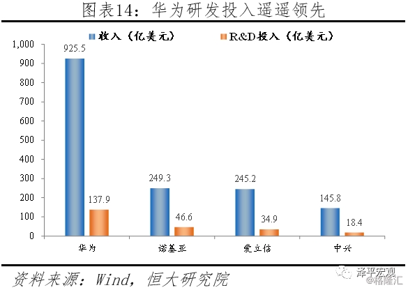 中国不断加大研发投入,在部分高科技领域与发达国家的差距逐渐缩小。2018年我国研发支出占GDP的比重为2.18%,而2000年这一比重仅为1.0%。截至2018年底,国家科技成果转化引导累计设立21支子基金,资金总规模达到313亿元。全年境内外专利申请比上年增长16.9%,授予专利权增长33.3%。中国在芯片制造、软件开发、航空等领域与以美国为代表的发达国家仍然存在差距,但中国在持续推进研发。以通信行业为例,当前全球四大通信设备巨头华为、、、中兴,中国占据其二。华为2017年销售额925.5亿美元,研发投入137.9亿美元,大幅超越传统通信设备巨头与。与美国无线通信巨头相比,华为的收入与研发投入体量同样领先。在过去十年内,华为在研发领域累计投入近4000亿人民币,目前拥有超过7万份专利(超过90%是发明专利)。在5G的标准制定上,华为也开始崭露头角,中国在全球通信领域话语权逐渐提高。