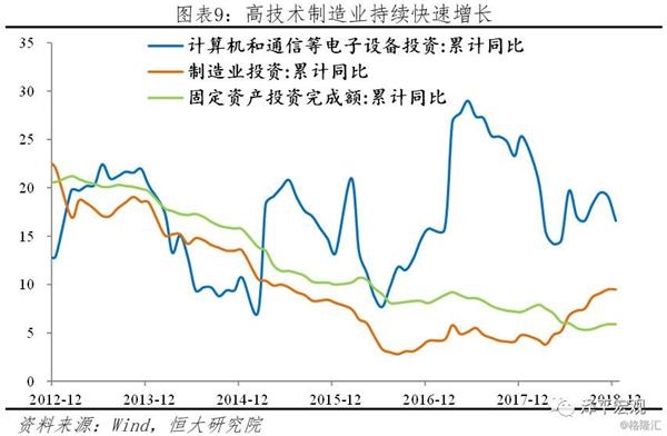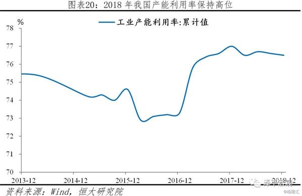 产能出清新周期验证,2018年制造业投资增速9.5%,较上年加快4.7个百分点。其中,高技术制造业、装备制造业投资同比分别增长16.1%和11.1%,增速分别比全部投资快6.6和1.6个百分点。2018年计算机通信、制造、投资分别同比增长16.6%、15.4%和15.4%。偏下游的行业如农副食品加工、纺织业、化学原料及制品、行业投资增速较低,分别为0.0%、5.1%、6.0%和4.0%。经过2010-2015年单边下滑,2016-2017年制造业投资已经触底,但受对“两高一剩”行业限贷、环保督查、供给侧去产能等制约,新增产能一直受限。产能新周期、设备更新等驱动2018年制造业投资超预期增长,产能利用率为76.5%。新周期的核心是:产能周期的第三个阶段,产能出清、行业集中度提升、剩者为王、企业盈利改善、不良率下降、资产负债表修复、为新一轮产能扩张蓄积能量。中央经济工作会议强调,“推动先进制造业和现代服务业深度融合,坚定不移建设制造强国”;“增强制造业技术创新能力”。