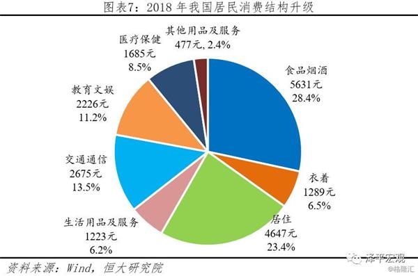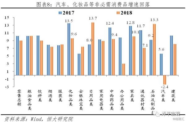 整体消费升级与部分人群消费降级并存。一方面我国居民恩格尔系数不断降低,消费结构升级。2018年食品烟酒支出占总支出比重为28.4%,较2017年下降0.9个百分点。根据联合国粮农组织提出的标准,恩格尔系数达到30%-40%为富裕水平,低于30%为最富裕水平,由此从消费结构指标看我国已连续两年保持在“最富裕”水平。同时,全国居民人均消费支出中,服务性消费占比为44.2%,比上年提高1.6个百分点,消费结构改善。另一方面,汽车、化妆品等非必需品消费增速下滑,带动消费增速下行,创2003年以来新低,但高端汽车消费却大增反映消费分层级背后的社会分层。2018年38.1万亿元,比上年增长9.0%,增速较上年放缓1.2个百分点,但仍高于全年增速5.9%。其中,汽车类、办公用品类、通讯器材类、化妆品类是主要拖累,分别较上年增速减少8.0、6.8、4.6和3.9个百分点。车辆购置税优惠取消、居民收入增长放缓和房贷高企挤压居民可支配收入是居民消费放缓的重要原因。