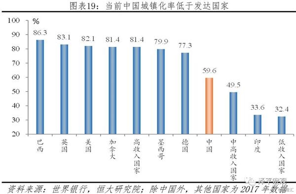 2018年城镇化率达到59.58%,比上年末提高1.06个百分点,城市化率保持稳步增长态势。过去四十年,中国城镇常住人口从1.7亿快速增至8.3亿,净增加6.6亿,城市化率从17.92%提升至59.58%,提高42个百分点,深刻地改变了中国经济社会格局,成就了过去中国重化工业、大规模基础设施投资、、消费升级等的飞速发展。目前,中国59.58%的城市化率稍高于54.83%的世界平均水平,但明显低于高收入经济体的81.53%和中高收入经济体的65.45%,中国城市化还有约20个百分点的空间,业发展还有很大潜力,而住房制度改革长效机制推出将促进市场平稳健康发展。2018年中国户籍人口城镇化率为43.37%,比上年末提高1.02个百分点。全国人户分离人口2.86亿人,其中流动人口2.41亿人,户籍改革和公共服务均等化有待推进。第一、二、三产业就业人口占比分别约为27%、28%和45%,其中第一产业就业人员占比大幅高于第一产业占GDP比重,第一产业就业人口向第二、三产业的转移还将持续。