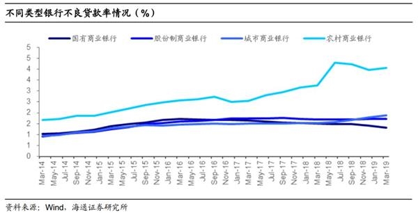 不良率分化明显,国有银行、股份制银行以及城商行不良贷款率处于较为平稳的状态,农商行有所上升。根据银保监会公布的19年1季度银行业经营情况,全行业总体不良率为1.80%,同口径下环比18年4季度持平。截至19年1季度末城商行不良率为1.88%,农商行平均则比较高,为4.05%,两者均环比4季度增加0.09%。从历史水平看,农商行不良率问题稍显严重,已经处在历史相对较高水平。