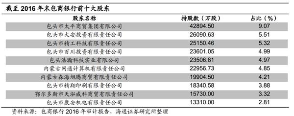 包商银行是1998年由中国人民银行批准,在原包头市17家城市信用社的基础上和包钢综合企业(集团)公司、包钢建筑安装工程公司等12家法人单位以及包头市财政局共同发起设立的股份制商业银行。根据其2016年审计报告,其股权结构中法人持股比例约为96.66%,国有股比例约为0.42%,个人股比例约为2.69%,集体股比例约为0.23%。