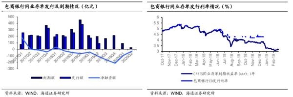 从后续包商银行同业存单发行情况来看,18年包商银行同业存单发行量依然较高,在去杠杆的背景下,仅有17年1季度、2季度以及18年1季度其同业存单净融资额为正,说明前期快速扩张后,同业存单带来的同业负债难以为继,对于同业负债占比较高的银行,同业负债收缩对于经营情况的影响较为明显。从发行利率来看,以1年期同业存单为例,包商银行同业存单发行利率与同期限同评级的同业存单收益率相比较高,在18年12月最高相差月59BP。另一方面根据财新报道,包商银行截至18年9月末其同业负债约为43.9%,同比下降幅度较小,且依然高于监管红线,也从侧面说明其同业负债历史包袱重,化解难度大。