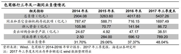 从包商银行本身经营结构来看,其负债端中同业负债占比较高且增长较快。我们以同业和其它金融机构存放款项、拆入资金、卖出金融资产款以及同业存单的金额大致代表银行同业负债情况。包商银行2014年-2016年末以及2017年9月末同业负债率分别为31.70%、29.06%、37.37%以及48.04%,基本呈现逐年上涨的趋势,2017年三季度末接近于50%。同业负债总额在2015年末、2016年末及2017年三季度末环比年初增长率分别为3.03%、58.31%以及73.97%,可以看出包商银行在2016年以及2017年前三季度同业负债增长非常快,远高于其总负债增长率。